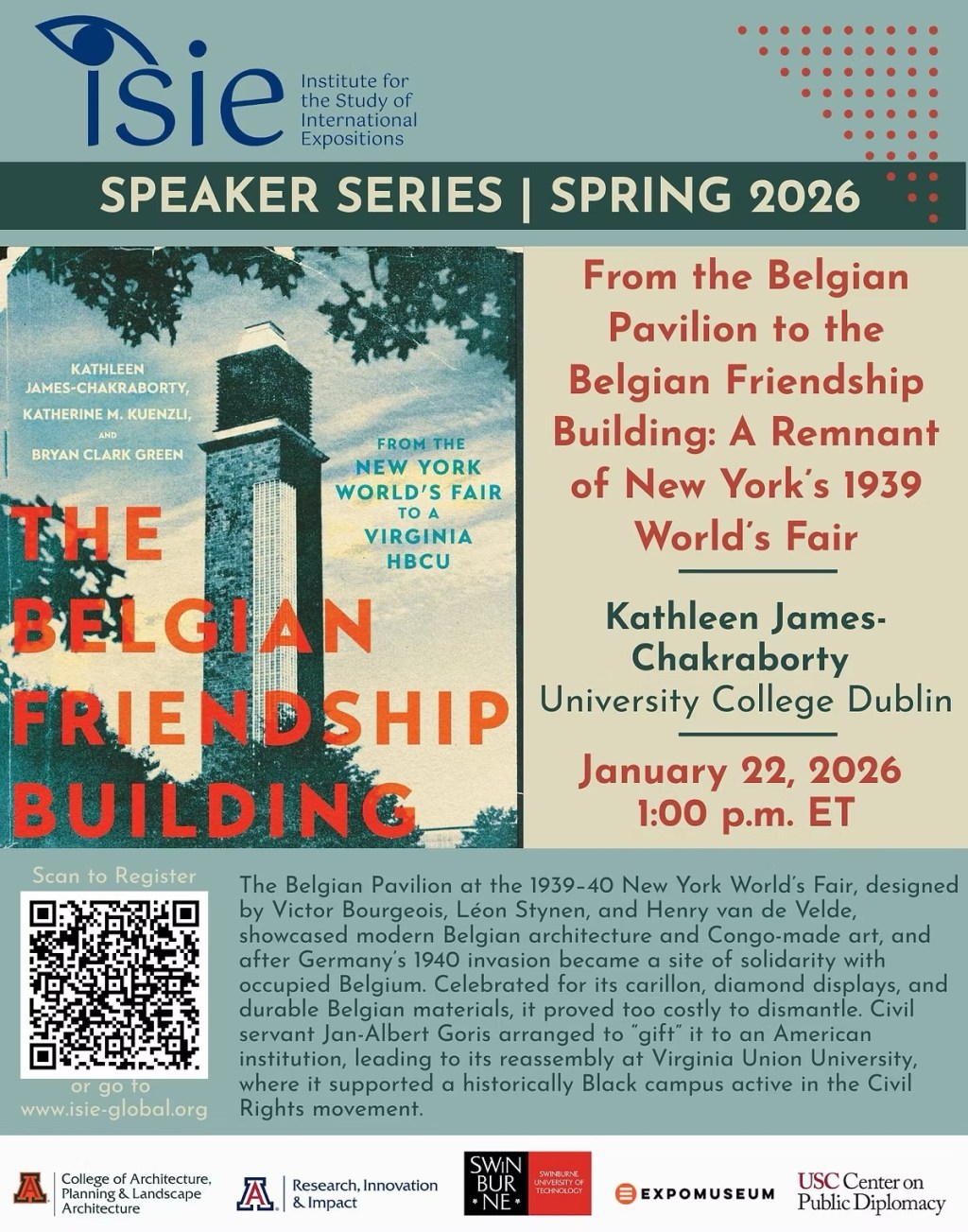 Kathleen James-Chakraborty presents her paper, ‘From the Belgian Pavilion to the Belgian Friendship Building: A Remnant of New York’s 1939 World’s Fair,’ at the ISIE Speaker Series on January 22, 2026.